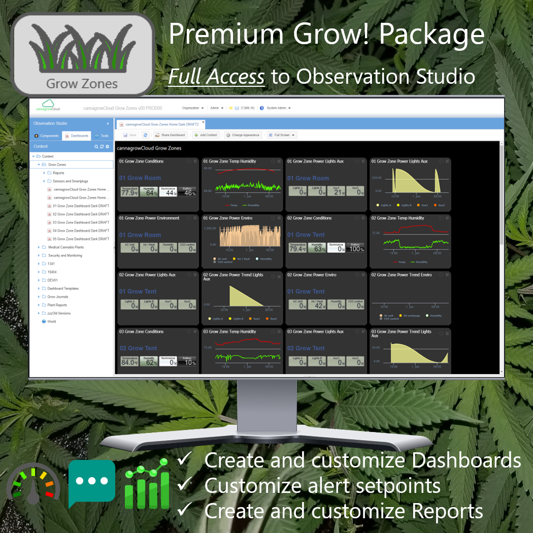 • Current conditions and 24-hour trendlines for each Grow Zone and Sensor including temp, humidity, power usage