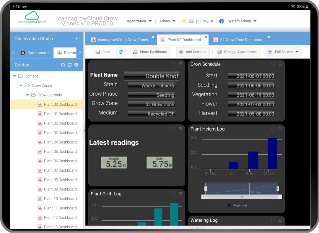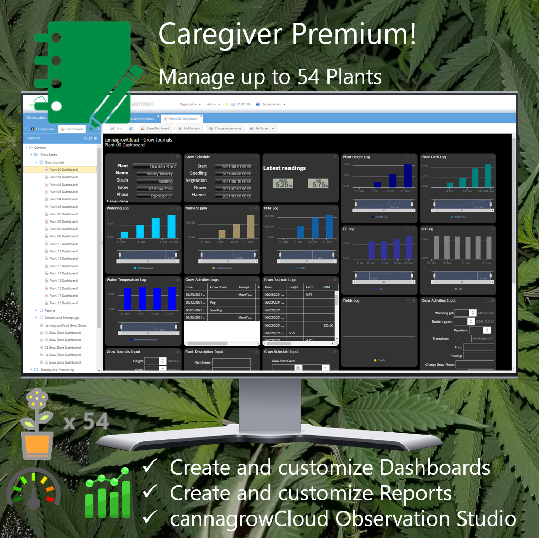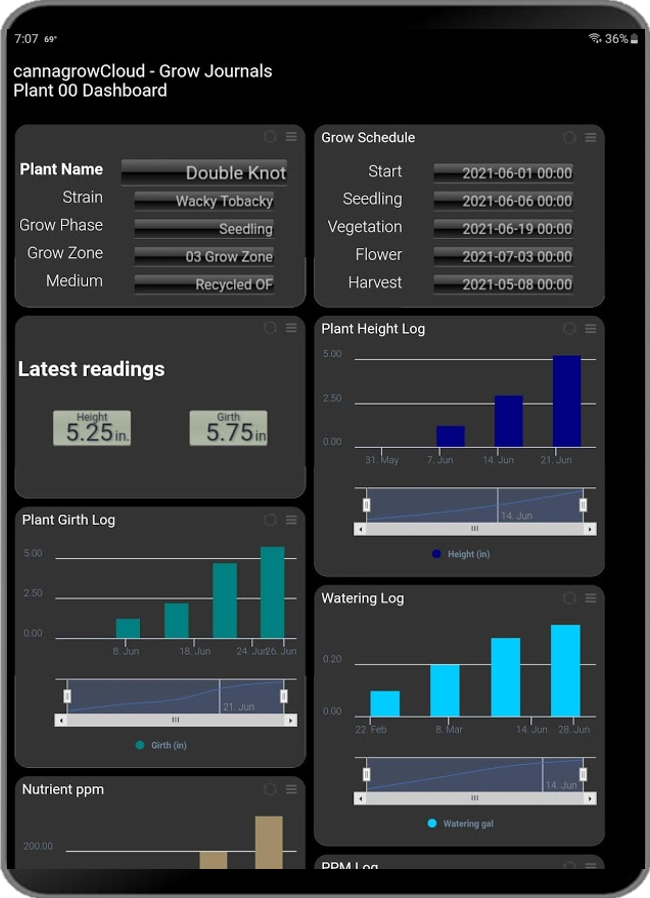 • Grow schedules, growth stage, watering amounts, nutrient solutions, and more