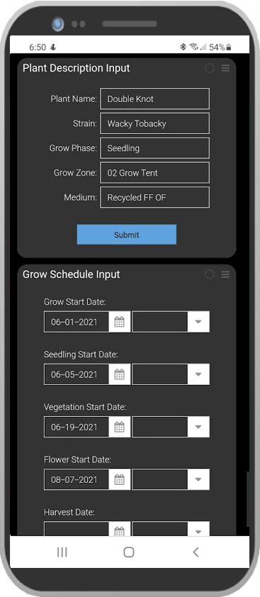 • Identify each plant by name, strain, and easily input dates for grow phases