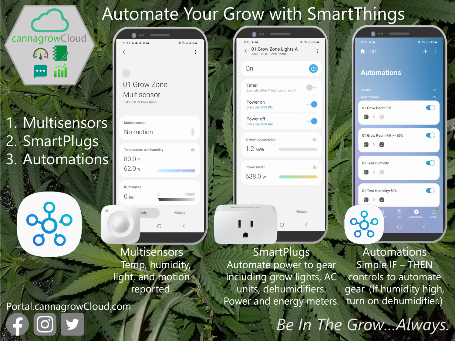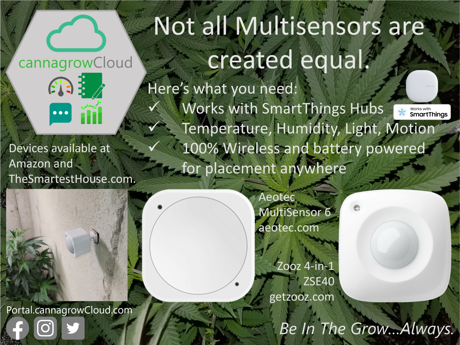 There are numerous smart devices on the market that are called "multisensors", you don't want most of them. Professional cultivators will tell you to monitor the temperature AND the humidity. Know the light levels getting to your plants. A temperature sensor with motion detection is not going to cut it for automating your grow. That's why we've identified and certified SmartThings multisensors that provide the function that cultivators need to monitor and automate their grows. These are the criteria for the multisensors you need.