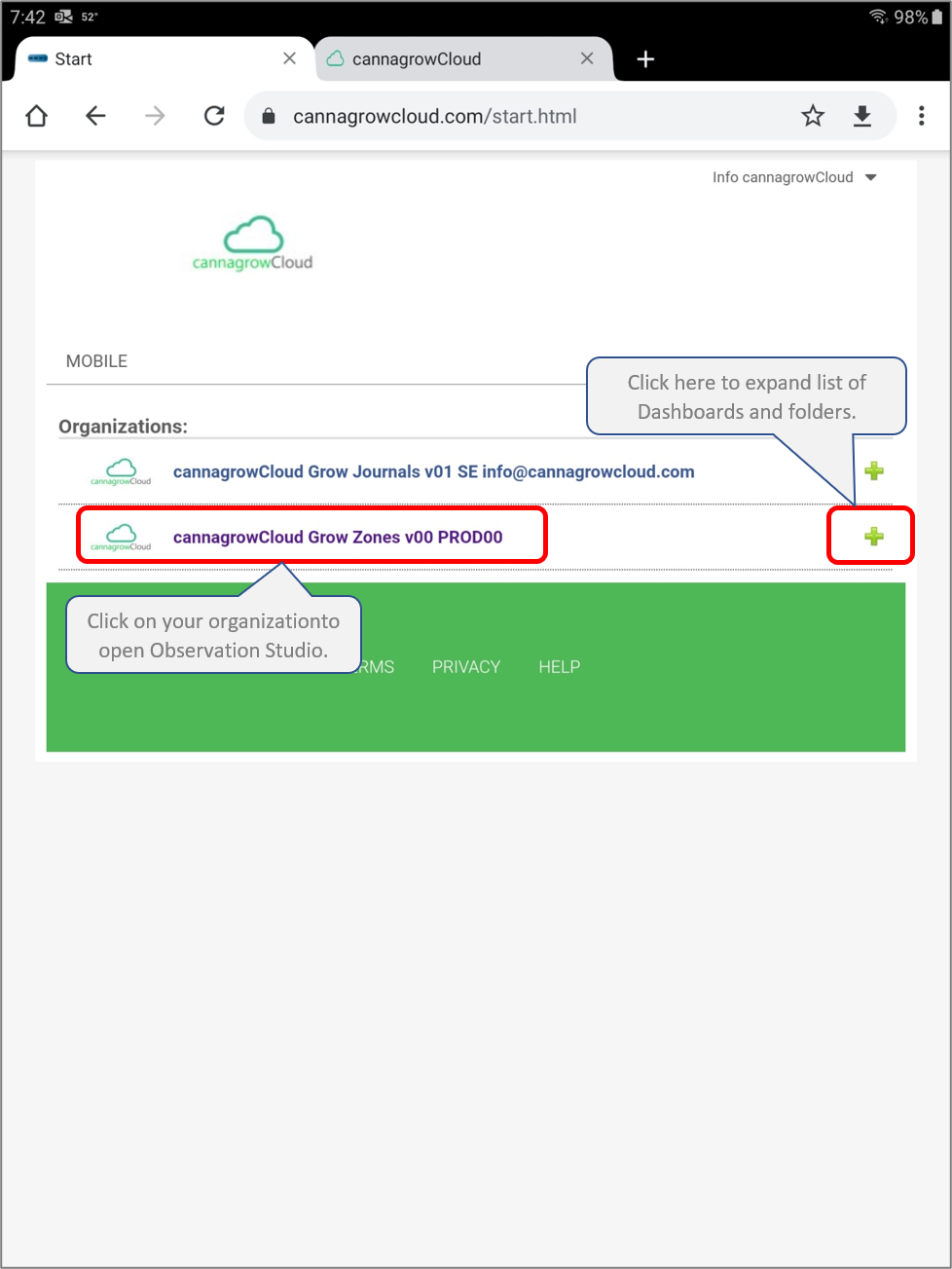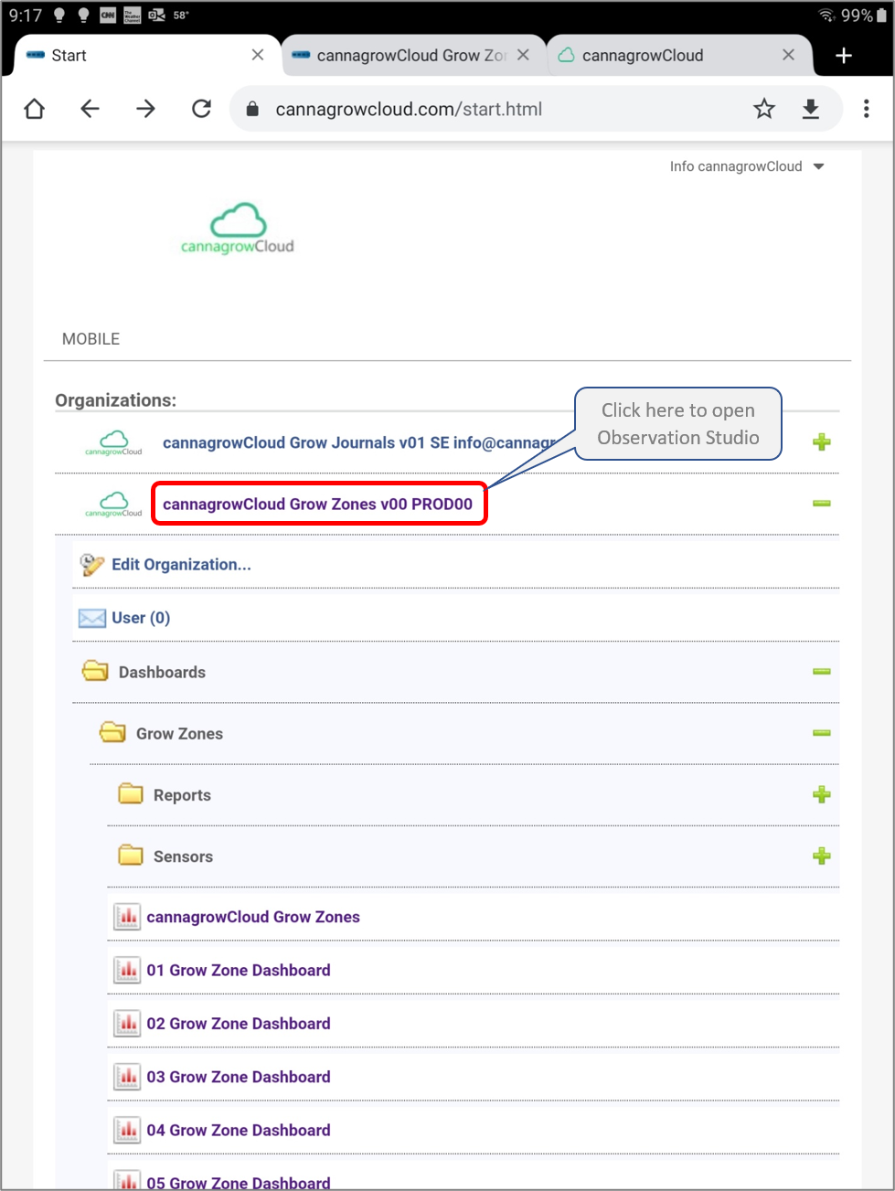 Click on your organization name on the cannagrowCloud start page to open Observation Studio.