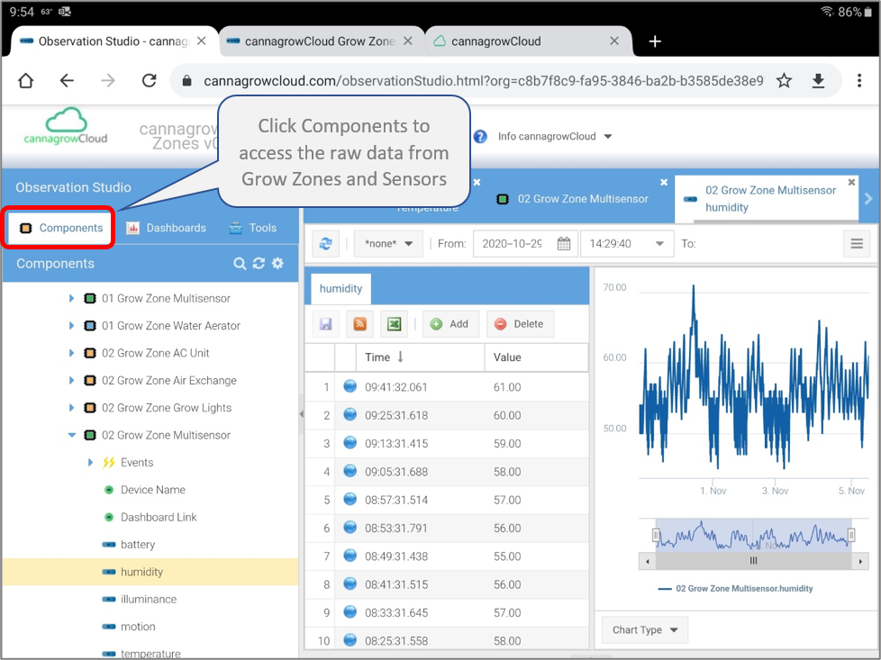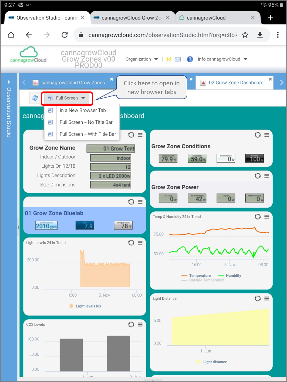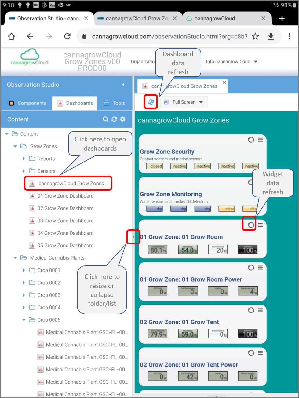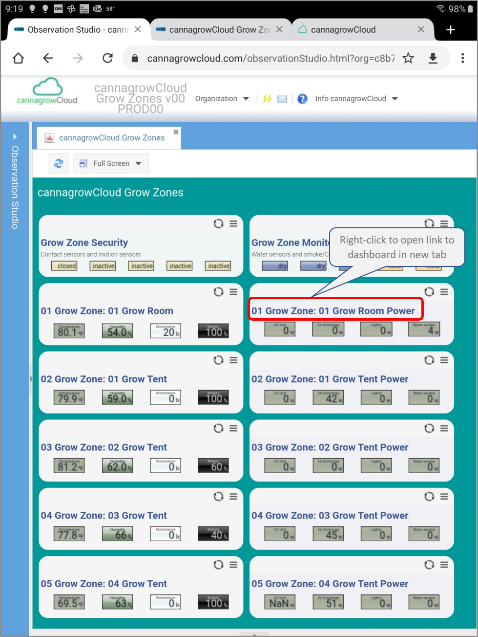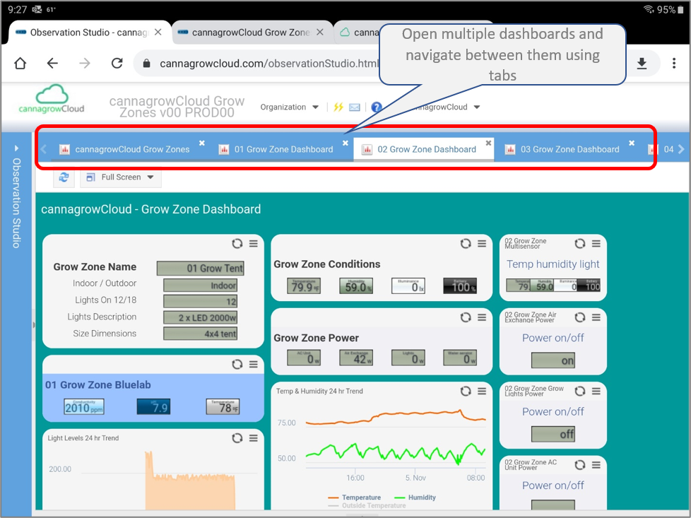 Observation Studio will open to your default Dashboard view, normally set to the cannagrowCloud Grow Zones overview dashboard.