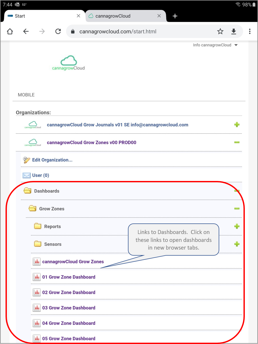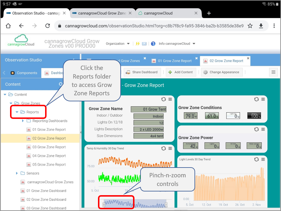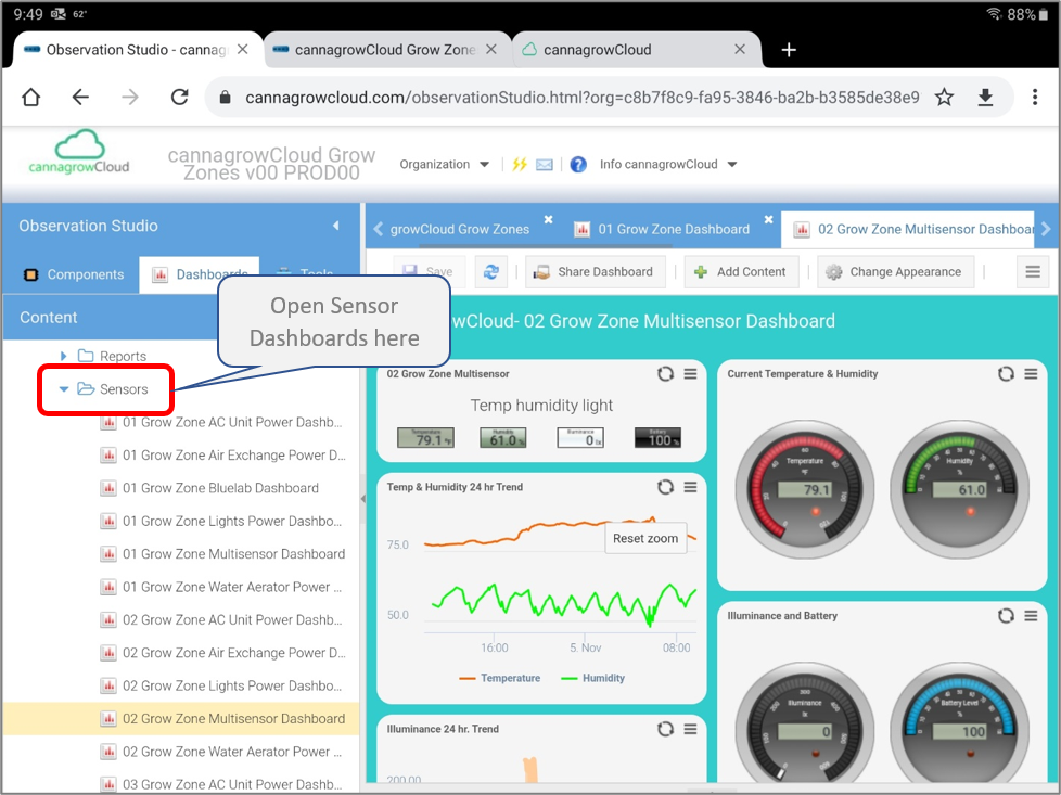 Expanding the menus will provide you links to Grow Zone Dashboards and folders for Sensors and Reports.