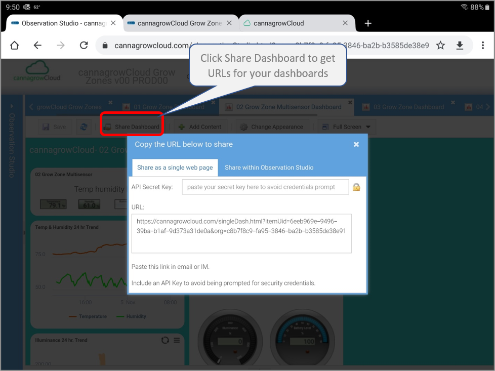 To get the URL for a dashboard, click on the Share Dashboard control.