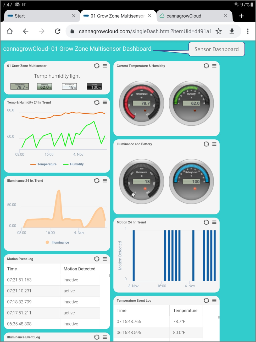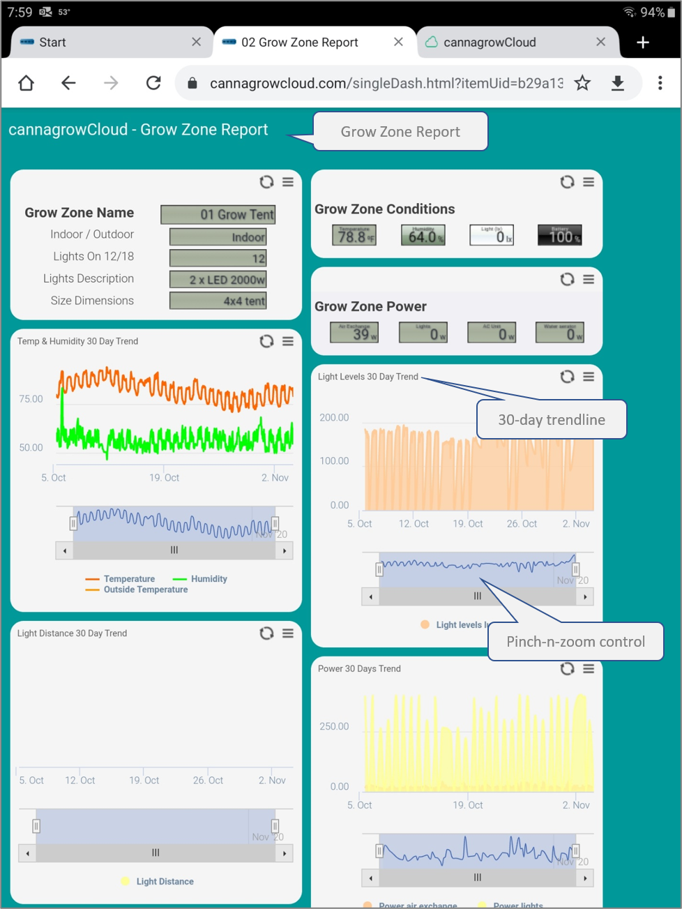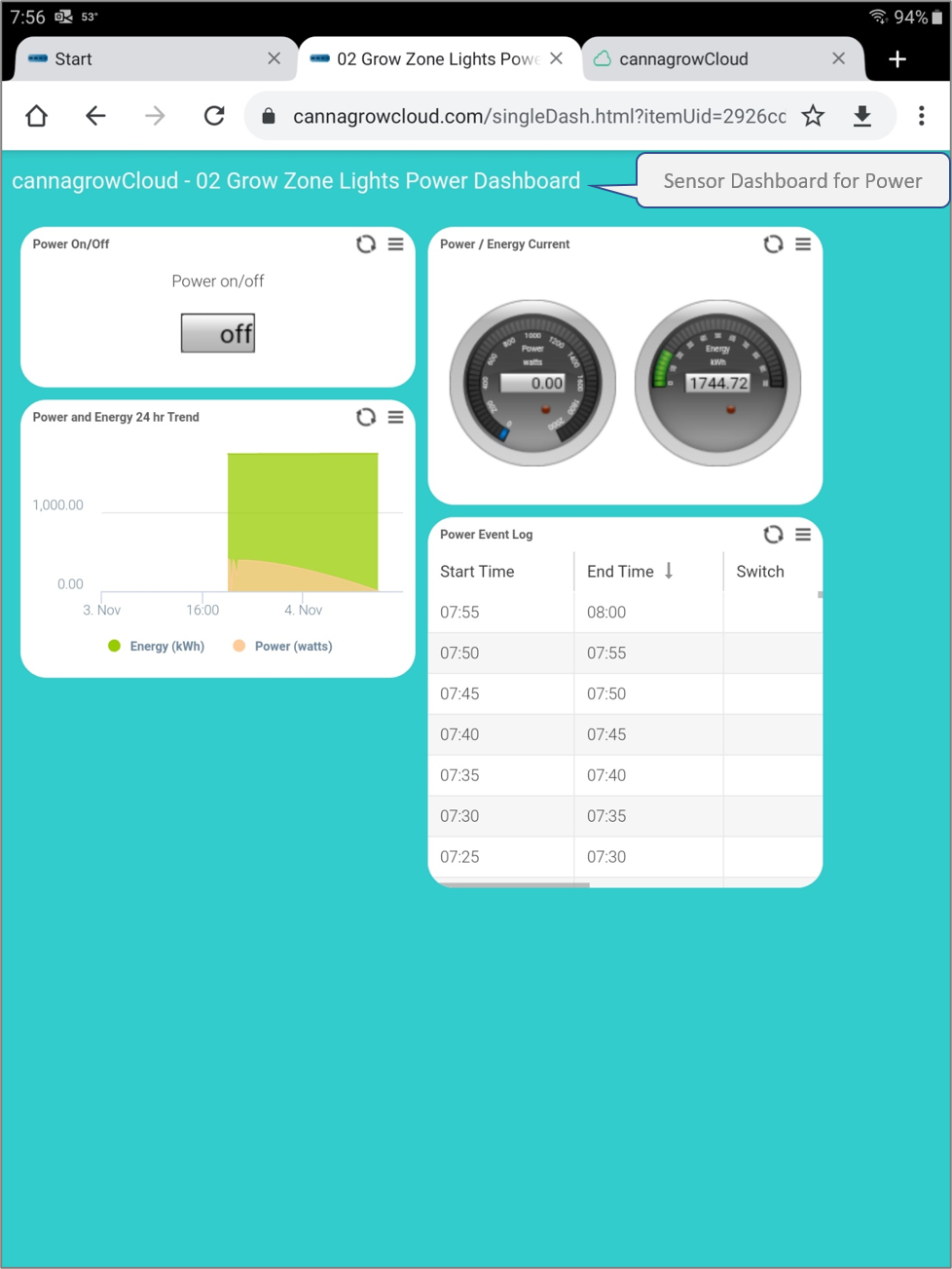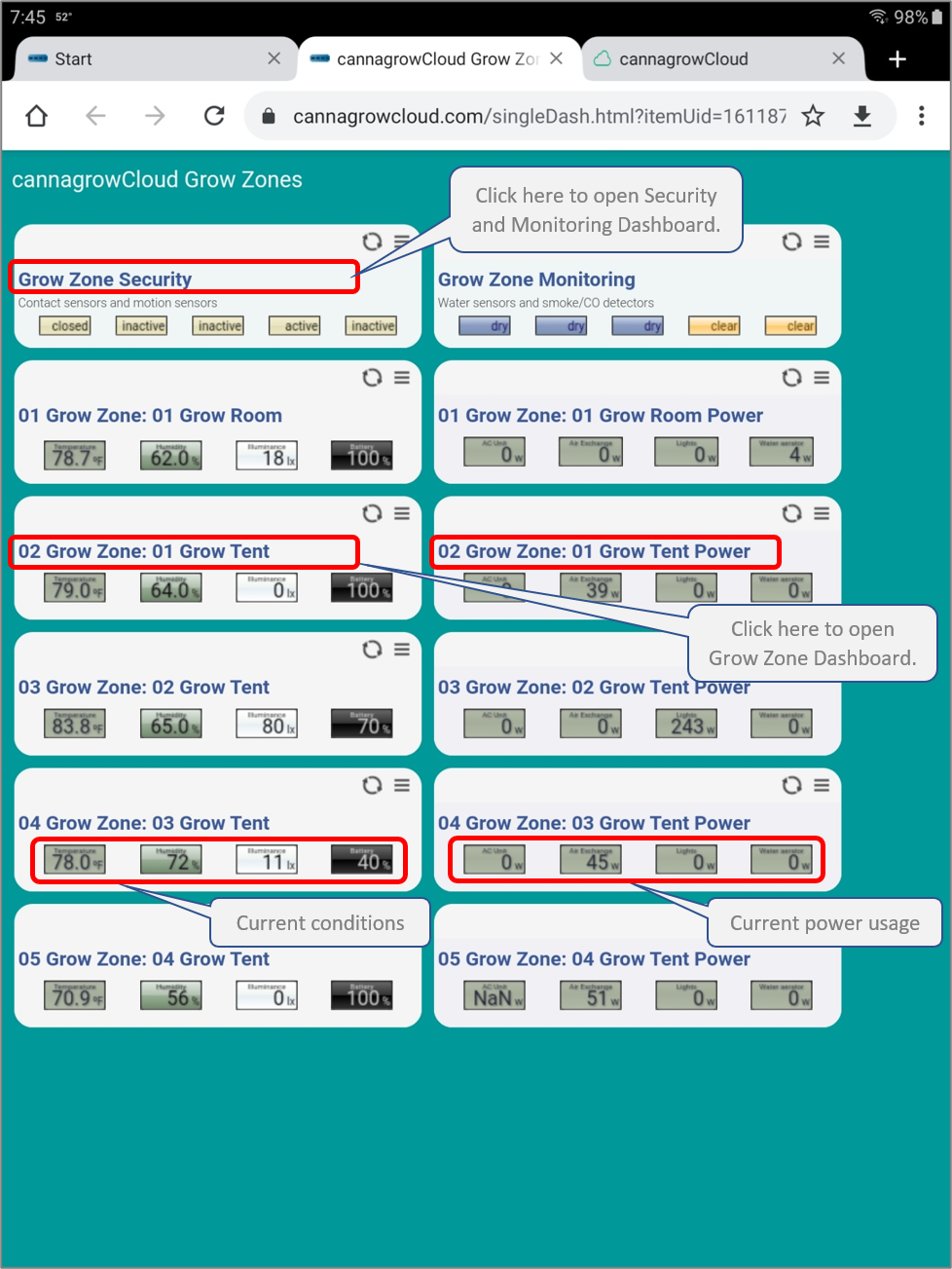 Click on cannagrowCloud Grow Zones to open the overview dashboard that shows current conditions and power usage for each Grow Zone and provides links to Grow Zone Dashboards.