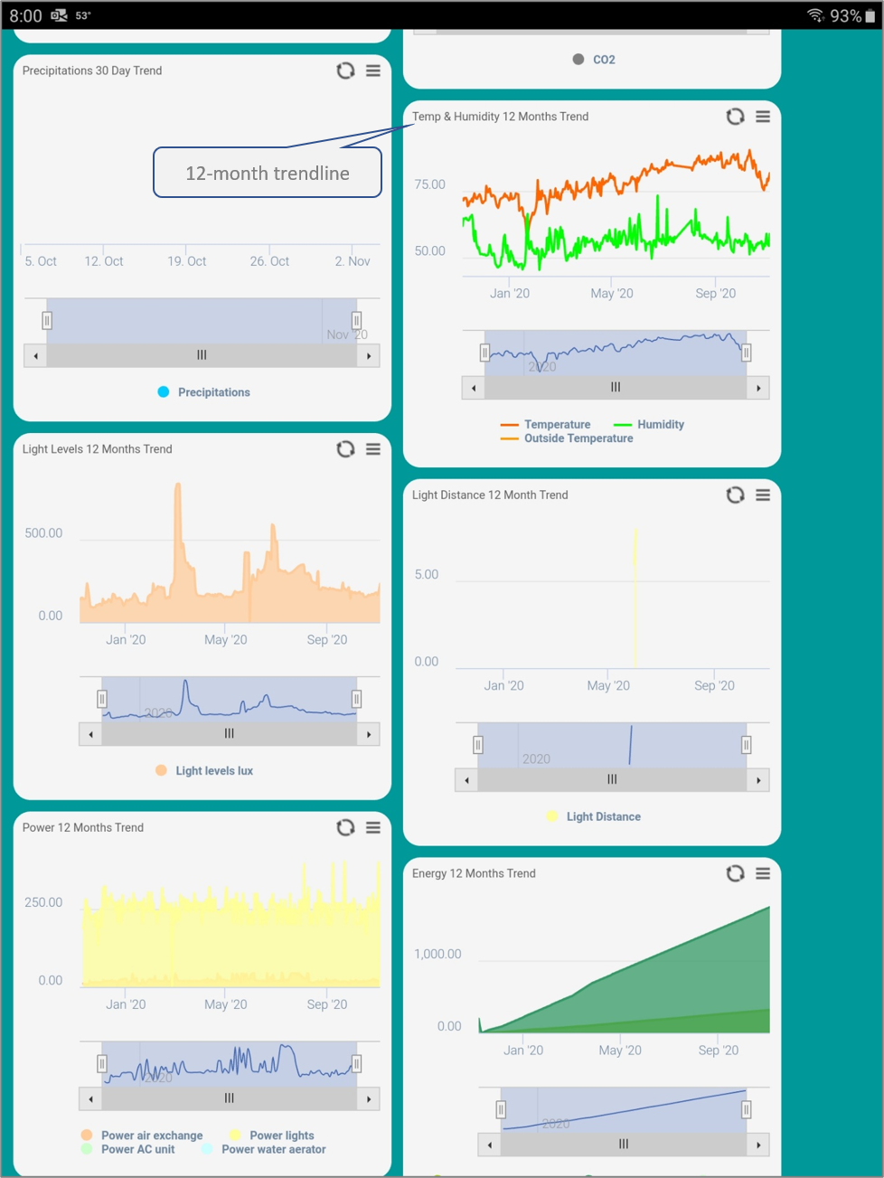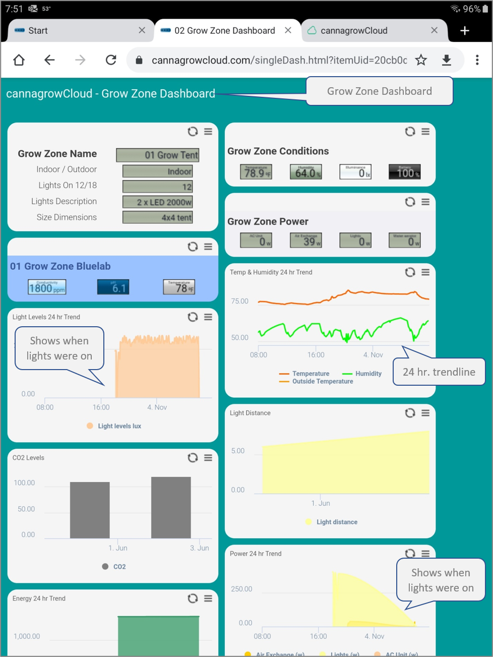 Grow Zone Dashboards provide current conditions, power usage, and 24 hour trendlines for temperature, humidity, light levels, and power usage. Review the 24 hour trends to see when devices are operating.