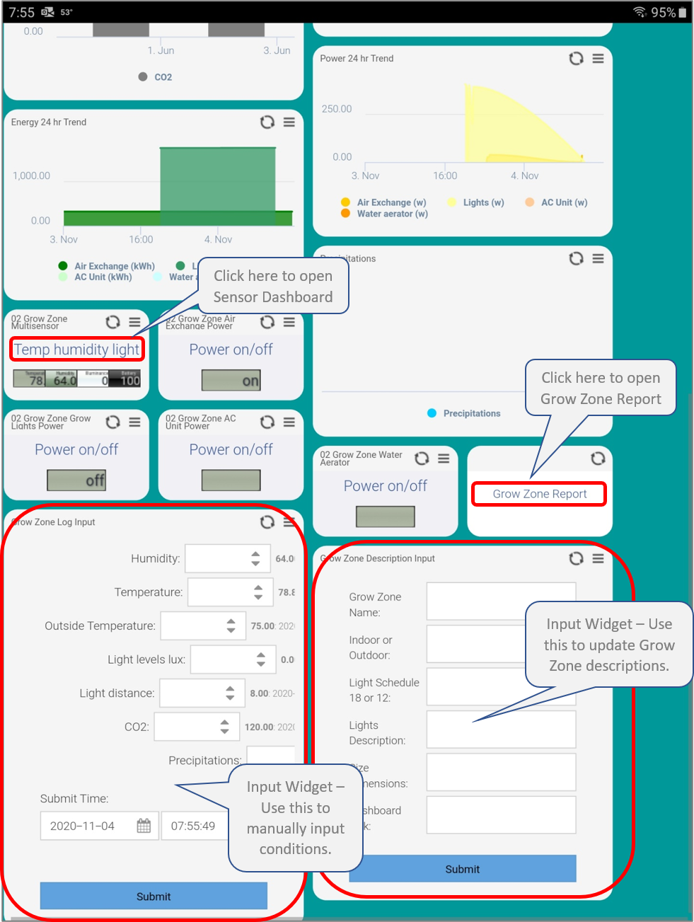 Use the Grow Zone Log Input widget to manually enter conditions and readings and the Grow Zone Description Input widget to input descriptions of your Grow Zone.